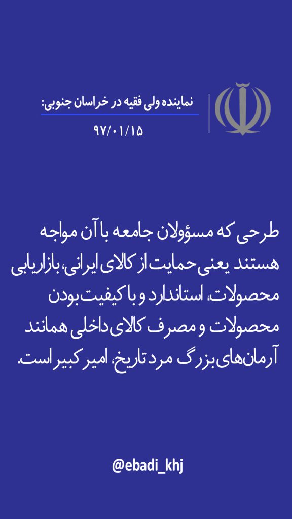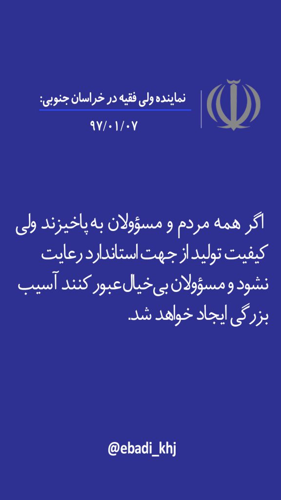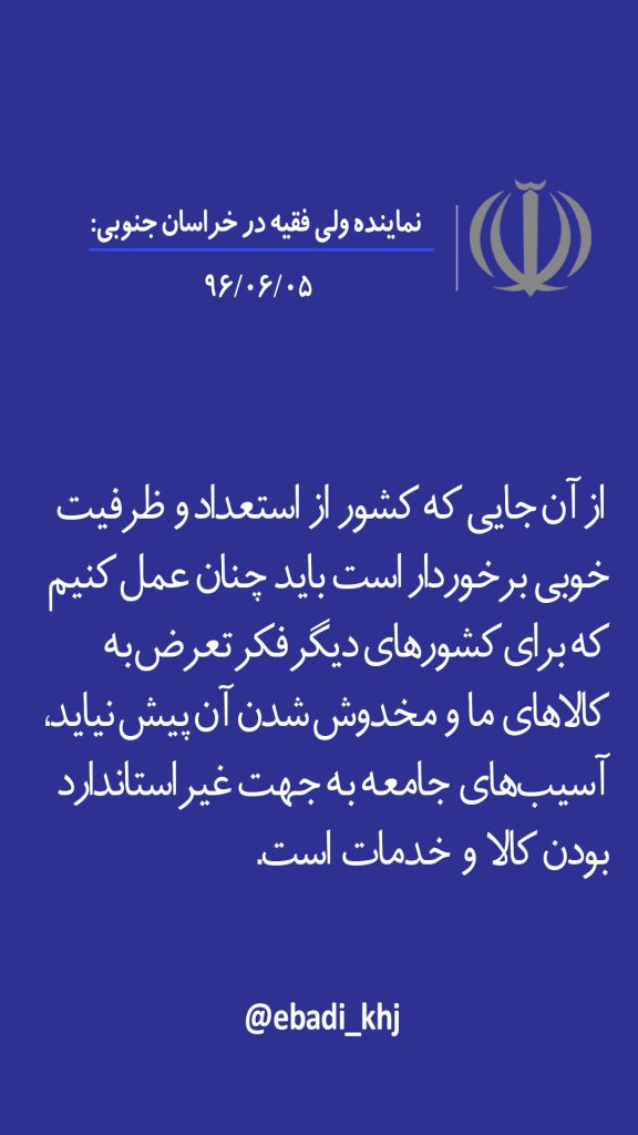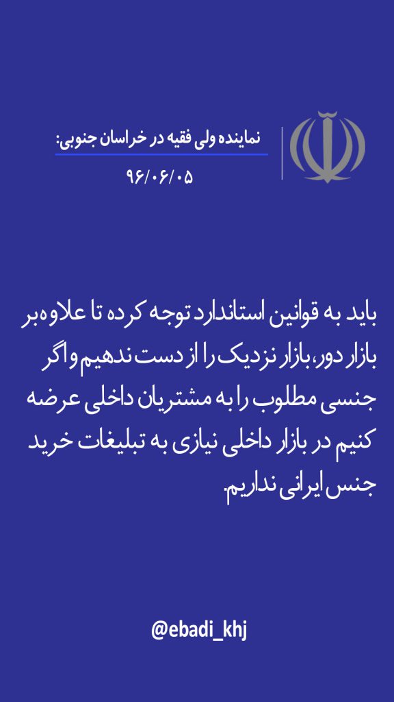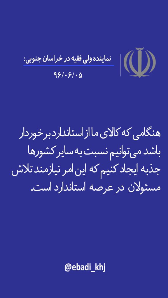بیانات نماینده ولی فقیه در خراسان جنوبی پیرامون روز جهانی استاندارد مهر ۲۲, ۱۳۹۸ عکس دیدگاه خود را بنویسید 26 نمایش ها نماینده ولی فقیه در خراسان جنوبی: هنگامی که کالای ما از استاندارد برخوردار باشد میتوانیم نسبت به سایر کشورها جذبه ایجاد کنیم که این امر نیازمند تلاش مسئولان در عرصه استاندارد است. 1398-07-22 Webmaster